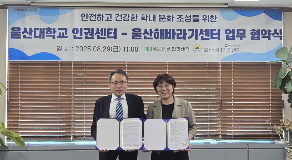 울산대 인권센터(센터장 도수관)는 울산해바라지센터(센터장 이주송)와 성폭력, 가정폭력, 스토킹 피해자를 위한 통합지원 체계 구축과 상호 협력 강화를 위한 업무협약을 체결했다. 이번 협약에 따라 양 기관은 ▲성폭력·가정폭력·스토킹 피해자 지원 활동 및 전문 상담 ▲의료·법률·심리치료 서비스 제공 ▲피해자 보호를 위한 사회적 공감대 확산 및 책임의식 고취 ▲실무 연계망을 통한 신속한 지원 등을 함께 추진하기로 했다. -2025.08.29.(금)-